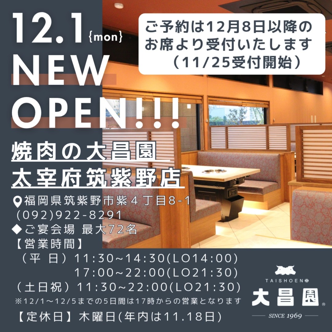 ◆12/1(月)OPEN!焼肉の大昌園 新店《太宰府筑紫野店》◆