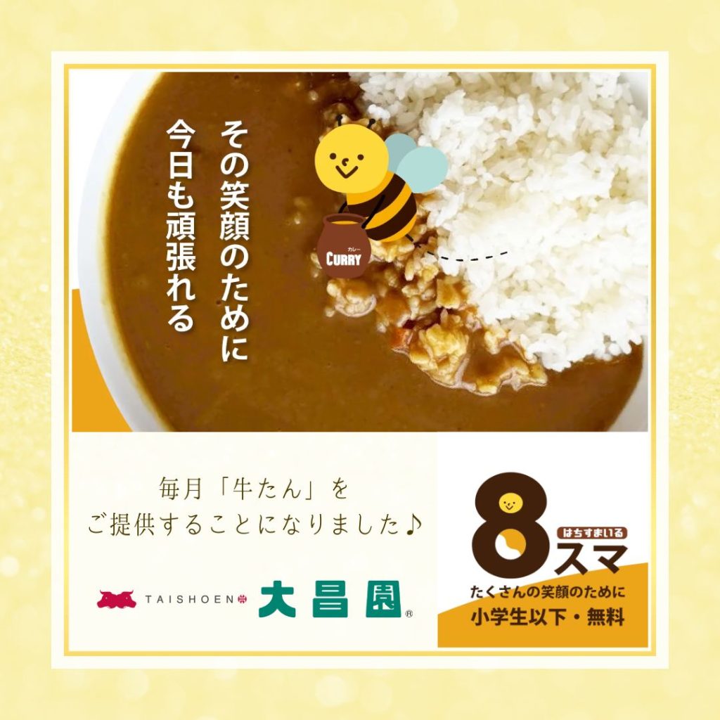 《8スマイルカレー》さんは地域の子ども達を温かく見守り、地域の人々とのつながりを育むことでやさしい社会を実現し、あたたかいつながりが実感できる地域を築いていきたいと「小学生以下は無料」で食べられるカレーをご提供されています。